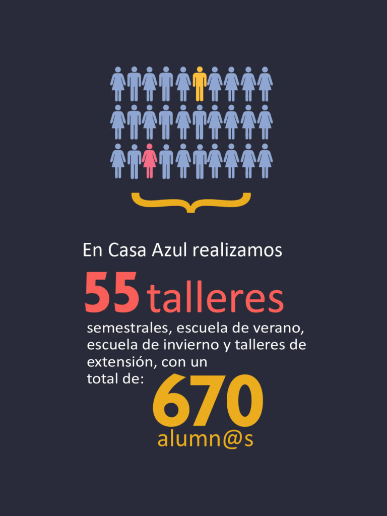 “este año nos acercamos a cientos de estudiantes de enseñanza básica y media a través de las diversas exposiciones que cada mes se renovaban en Casa Azul, desde joyas hasta ilustraciones, pinturas, carteles y fotografías. Este espacio brinda un lugar para que artistas regionales y nacionales puedan llegar a nuevos públicos, y estamos trabajando constantemente en la formación de públicos desde los más pequeños”.